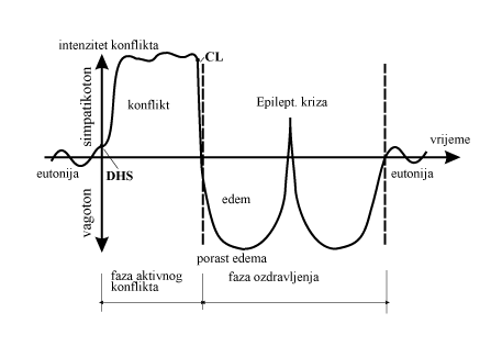 Predstavljeni su: eutonija, što znači normalan dan/noć ritam, kao i šema idealnog toka konflikta, uključujući fazu ozdravljenja, koja nije prekidana recidivima konflikta i može da se završi sa jednom jedinom epileptoidnom krizom. x-osa=vrijeme(t); y-osa=intenzitet konflikta